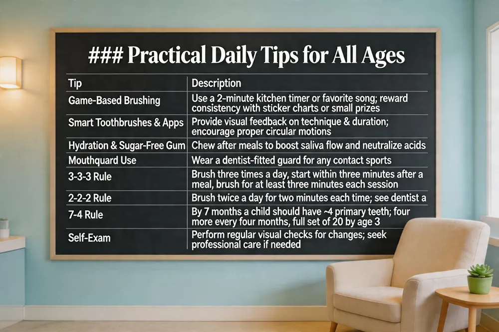 Helping children develop lifelong oral‑hygiene habits is easier when you turn the routine into a game. Use a two‑minute kitchen timer or a favorite song to keep brushing on track, and reward consistency with sticker charts or small prizes. Smart toothbrushes and brushing apps provide visual feedback, encouraging proper technique and duration. Encourage regular hydration and sugar‑free gum after meals to boost saliva flow and neutralize acids. For active kids, a dentist‑fitted mouthguard protects teeth during sports and reduces injury risk.