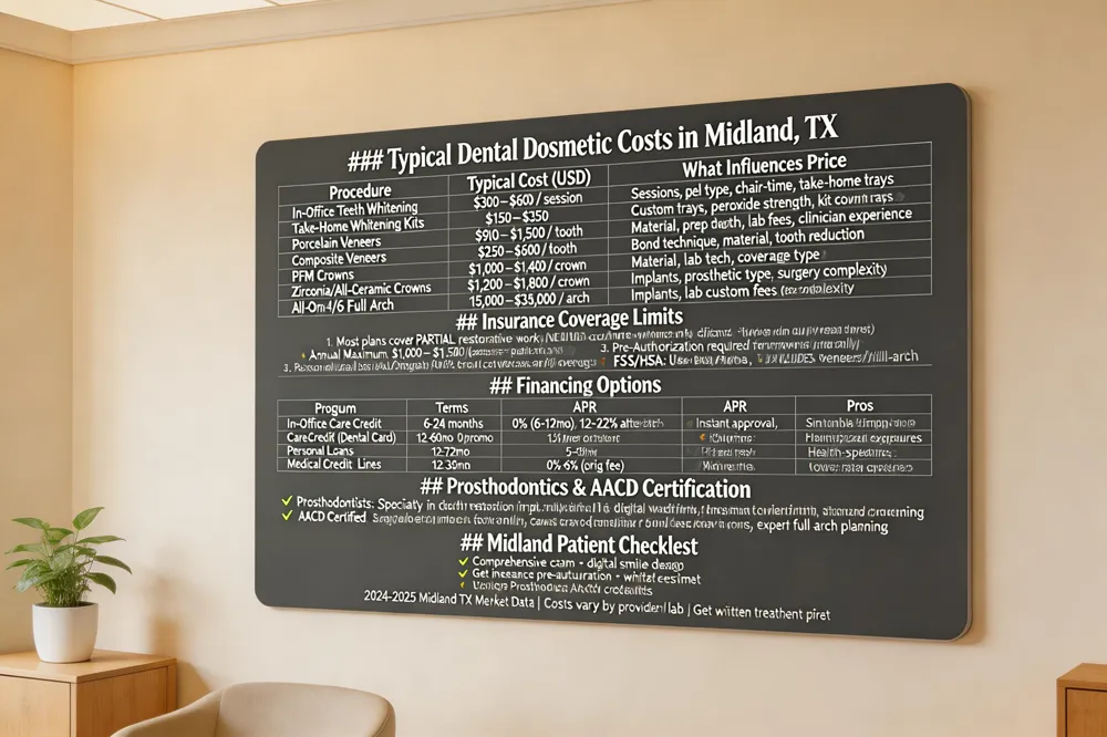 Understanding the financial side of cosmetic dentistry helps patients set realistic expectations. In Midland, professional in‑office teeth whitening typically runs $250‑$450, while premium options can reach $400‑$500. Porcelain veneers cost about $1,000‑$2,200 per tooth, and all‑porcelain or porcelain‑fused‑to‑metal crowns range $1,200‑$1,600. A full‑arch makeover with implants or bridges can exceed $7,000, and comprehensive smile makeovers often surpass $10,000. Most insurance plans treat these procedures as elective, so they rarely cover whitening, veneers, or bonding; however, crowns and implants may receive partial reimbursement when they address functional needs. To bridge the cost gap, many offices offer flexible third‑party financing, payment plans, or credit options that spread expenses over months.