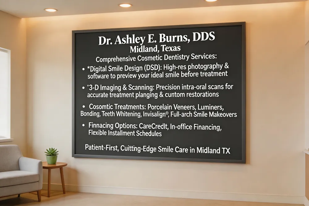 In Midland, Texas, Dr. Ashley E. Burns, DDS offers a full suite of cosmetic dentistry services designed to enhance both the appearance and health of your smile. The practice provides professional teeth‑whitening, porcelain veneers, composite bonding, custom‑fabricated dental crowns, and complete full‑smile design plans that address stains, chips, gaps, and uneven spacing while preserving as much natural tooth structure as possible.