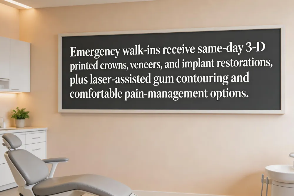 If you need immediate dental help in Midland, TX, Dr. Ashley E. Burns, DDS welcomes walk‑in patients at the office on 5016 Briarwood Ave. With a single call to (432) 217‑0089, urgent cases—severe pain, broken teeth, or gum trauma—are placed on the earliest available slot, often the same day. The practice combines advanced digital workflows with on‑site 3‑D printing, allowing same‑day fabrication of ultra‑thin porcelain veneers, high‑strength zirconia crowns, and implant restorations that fit precisely without weeks of lab work. Laser‑assisted gum contouring and AI‑driven shade‑matching further streamline treatment while minimizing discomfort. Pain‑management options include nitrous oxide, oral sedation, and laser‑softened preparation, ensuring a comfortable experience for every patient. After emergency care, follow‑up appointments and personalized oral‑health plans are provided to preserve results and promote long‑term smile health.