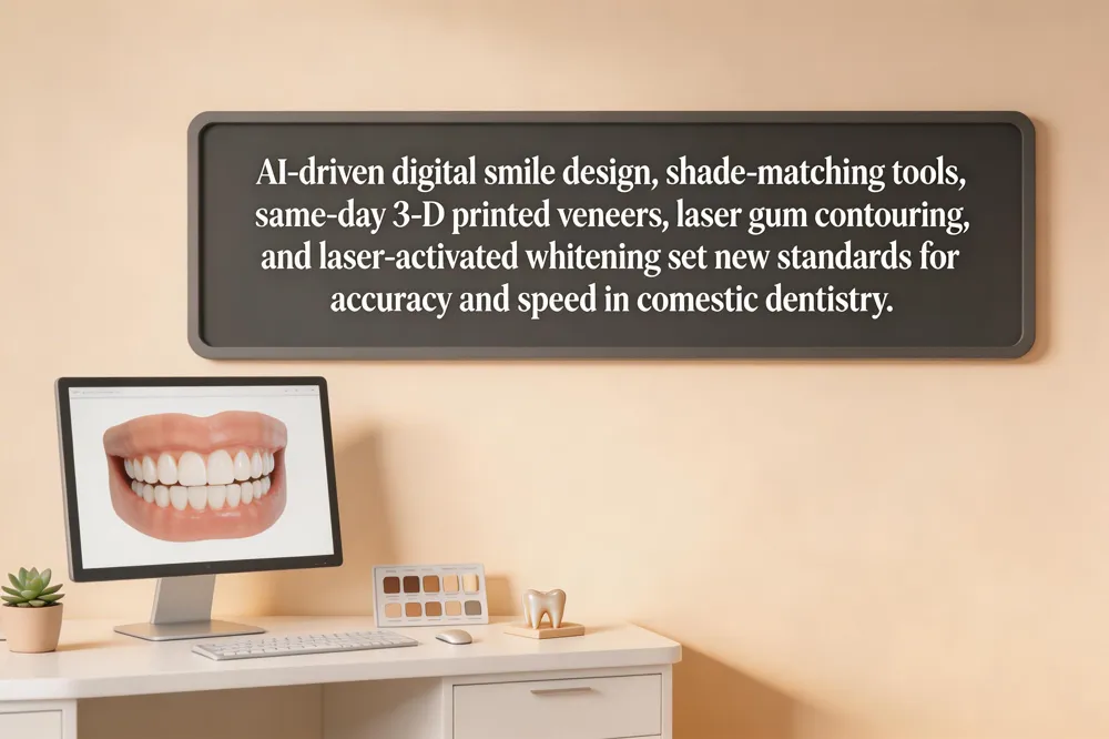 In 2026, AI-driven digital smile design (DSD) and shade‑matching tools have become standard, allowing dentists to create realistic 3‑D simulations and predict outcomes with over 95% accuracy before any tooth preparation. Same‑day 3D printing now fabricates ultra‑thin porcelain veneers, high‑strength crowns, and even implant abutments in the office, cutting turnaround times from weeks to hours while preserving precise fit. Laser‑assisted gum contouring reshapes gingival tissue without stitches, offering rapid healing and minimal discomfort, while laser‑activated whitening delivers dramatic shade changes in a single session with reduced sensitivity. Minimal‑prep ultra‑thin veneers, often requiring less than 0.3 mm of enamel removal, preserve natural tooth structure and can be bonded directly, providing a conservative, natural‑looking smile makeover.