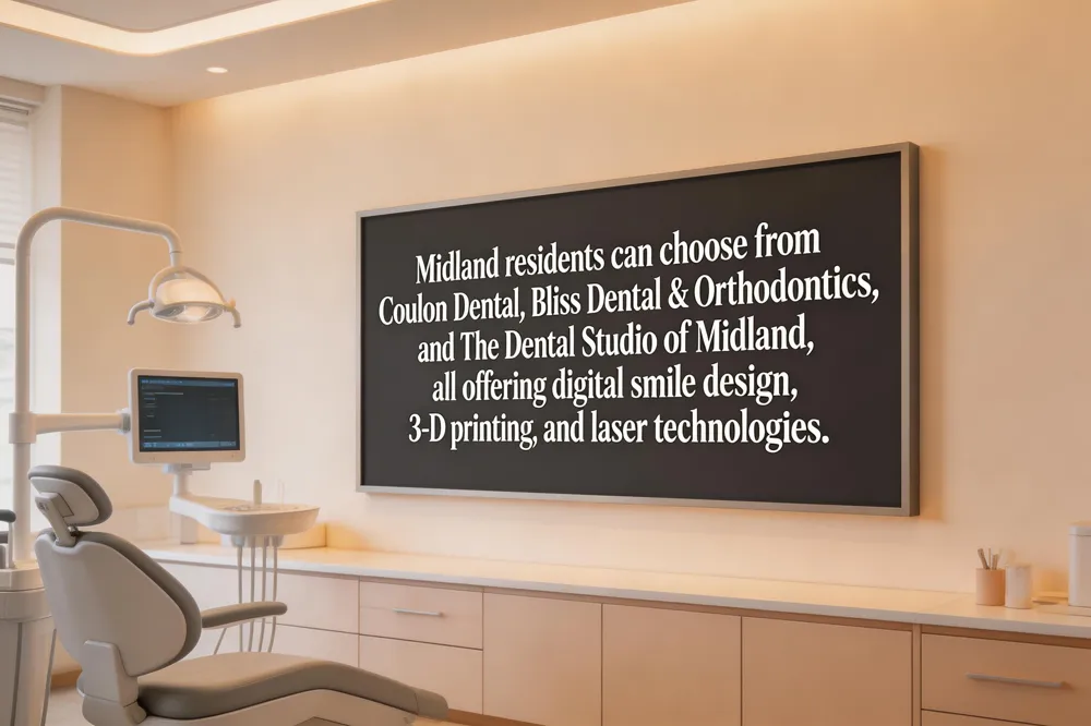 Midland residents have several high‑tech options for cosmetic and restorative care. Coulon Dental, located at 4505 Holiday Hill Rd Ste 200, offers a family‑focused practice with preventive, restorative, and cosmetic services—including crowns, veneers, and implants—under Dr. Ryan Coulon, with modern technology and flexible Monday‑Thursday hours. Bliss Dental & Orthodontics at 4400 North Midkiff Rd Ste A‑1 provides a full suite of general, cosmetic, and orthodontic treatments (braces, Invisalign) led by Drs. Dustin McBride, Nathan Galloway, and Michael Onyema, and is conveniently open Monday‑Friday near local retail. The Dental Studio of Midland (414 Veterans Airpark Ln) specializes in full‑arch implant solutions using Prettau® zirconia, same‑day temporary bridges, and optional IV sedation, all managed by Drs. Tye Thompson and Jordon Green. All three practices employ digital smile design, 3‑D printing, and laser gum contouring, offering same‑day restorations and minimally invasive options. Patients choose based on location, technology preferences, financing flexibility, and the breadth of cosmetic services that match their aesthetic goals.