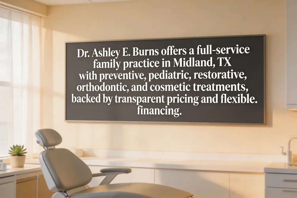 Family dentist Midland, TX – Dr. Ashley E. Burns, DDS offers a full‑service family practice in Midland, Texas, providing preventive cleanings, pediatric care, routine restorations, crowns, orthodontics, and emergency services for patients of every age. The office uses digital smile design, intra‑oral scanners, and same‑day 3‑D printed restorations to ensure precise, comfortable treatment.