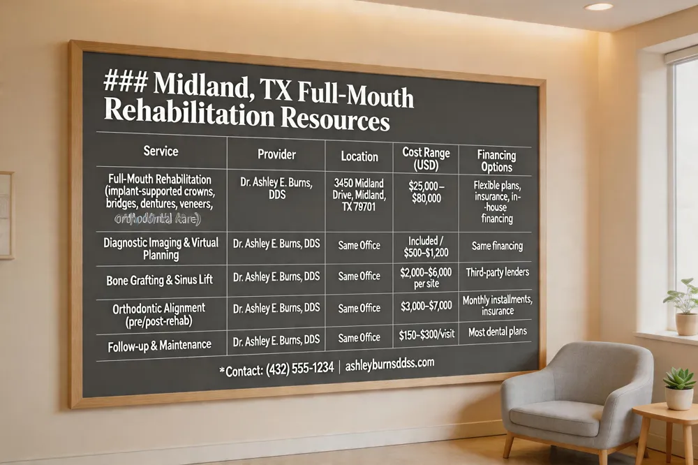 You can receive comprehensive full‑mouth rehabilitation in Midland from Dr. Ashley E. Burns, DDS. Her practice offers implant‑supported crowns, bridges, dentures, veneers, orthodontic alignment, and gum‑disease treatment—all coordinated by a multidisciplinary team. The office is located at 3450 Midland Drive, Midland, TX 79701. Call (432) 555‑1234 or visit ashleyburnsdds.com to schedule a consultation where Dr. Burns will evaluate your oral health, discuss goals, and craft a personalized plan using digital imaging, CAD/CAM milling, and same‑day restorative options.