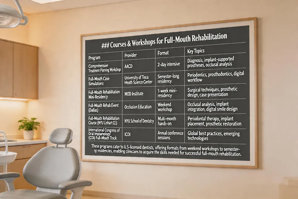 These programs cater to U.S‑licensed dentists, offering formats from weekend workshops to semester‑long residencies, enabling clinicians to acquire the skills needed for successful full‑mouth rehabilitation.