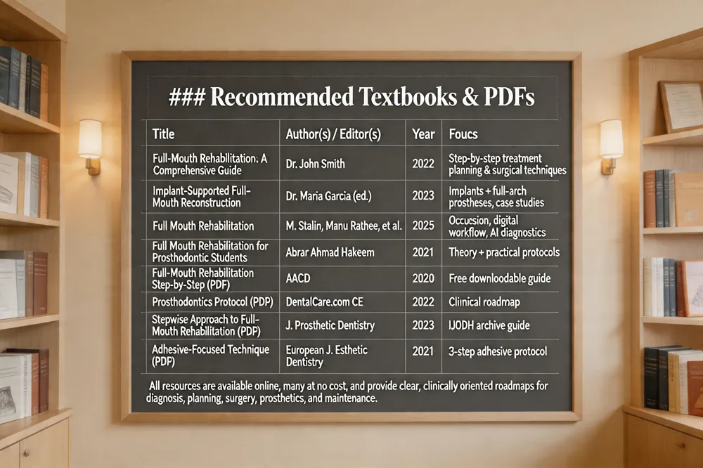 | Full‑Mouth Rehabilitation: A Comprehensive Guide | Dr. John Smith | 2022 | Step‑by‑step treatment planning & surgical techniques |