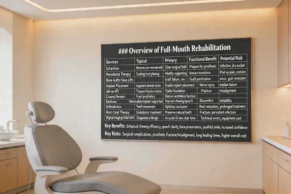 Full‑mouth rehabilitation (FMR) integrates a spectrum of dental services to restore function and aesthetics. The treatment plan may include extractions, periodontal therapy, bone grafts, implant placement (often All‑on‑4®), crowns, bridges, onlays, veneers, dentures, orthodontic alignment, and root‑canal therapy. Digital imaging, CAD/CAM milling, and 3‑D printed mock‑ups ensure precise diagnostics and prosthesis design. Health advantages are substantial: improved chewing efficiency, speech clarity, prevention of decay, periodontal disease, and bone loss, and a more youthful smile that boosts confidence. However, risks exist. Surgical complications can include infection, nerve injury, sinus perforation, or implant failure, especially in smokers or patients with poor bone quality. Prosthetic issues such as fracture, mis‑alignment, or bulkiness may occur if lab work is sub‑optimal. Long healing times and higher costs are also considerations. Patients should discuss these factors with their multidisciplinary team to weigh benefits against potential downsides.