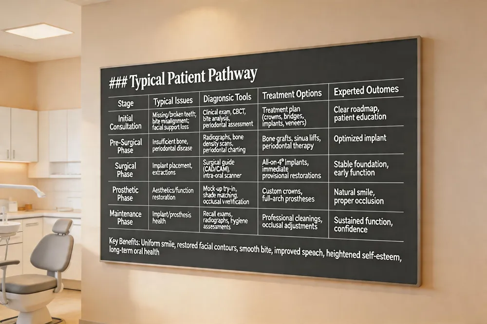 | Initial Consultation | Missing, broken, worn teeth; bite misalignment; loss of facial support | Clinical exam, digital imaging (CBCT), bite analysis, periodontal assessment | Comprehensive treatment plan (crowns, bridges, implants, veneers, orthodontics) | Clear roadmap, patient education |
