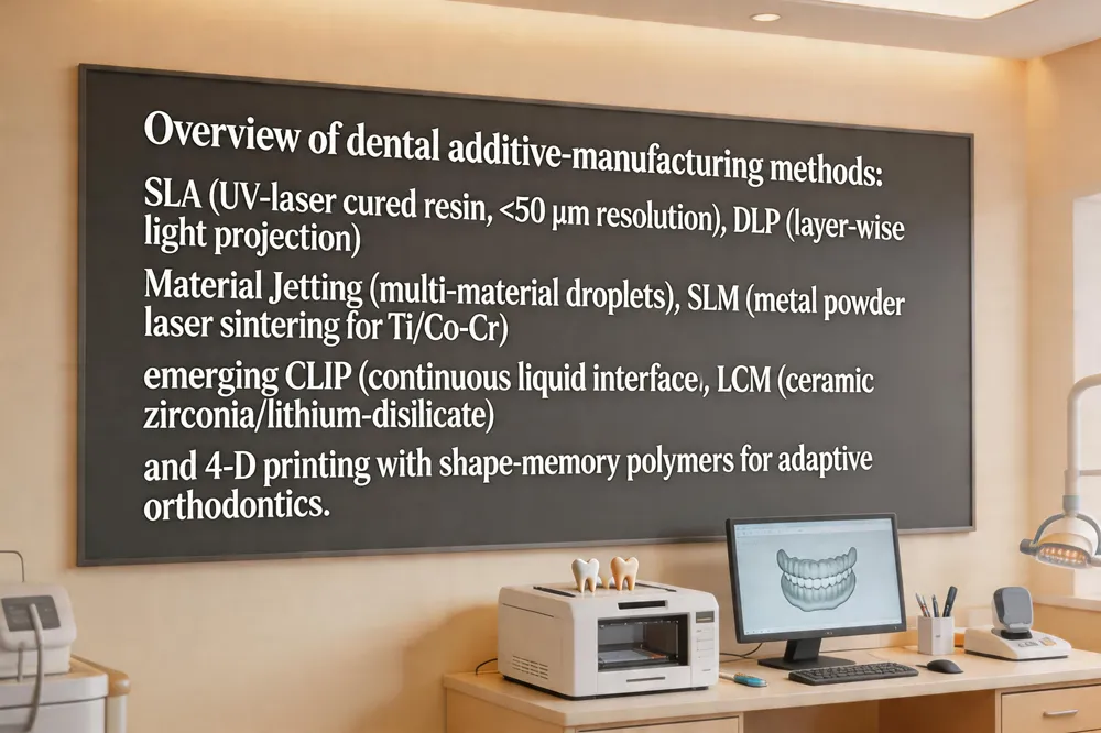 Three‑dimensional (3D) printing is reshaping modern dentistry through a suite of additive‑manufacturing methods. Stereolithography (SLA) uses a UV laser to cure photopolymer resin layer‑by‑layer, delivering sub‑50 µm resolution and excellent surface finish. Digital Light Processing (DLP) projects a patterned light image to cure an entire layer at once, offering speed comparable to SLA with similar accuracy. Material Jetting (MJ) deposits droplets of photopolymer via ink‑jet heads, enabling multi‑material, multi‑color prints ideal for aesthetic prostheses and educational models. Selective Laser Melting (SLM) fuses metal powder with a laser to produce titanium or cobalt‑chrome frameworks for implants, abutments, and partial denture bases. Emerging processes such as Continuous Liquid Interface Production (CLIP) eliminate the peeling step, dramatically increasing speed, while Lithography‑Based Ceramic Manufacturing (LCM) enables direct printing of zirconia and lithium‑disilicate ceramics. 4‑D printing adds stimuli‑responsive shape‑memory polymers for adaptive orthodontic devices.