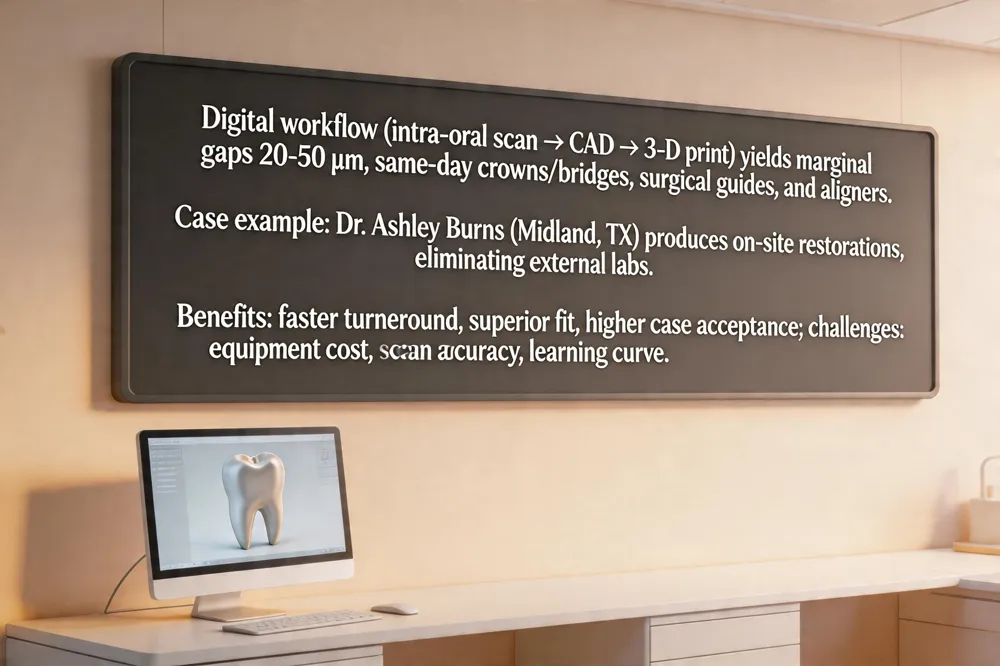 Digital dentistry transforms prosthodontics, crowns, bridges, and implant‑supported prostheses by capturing intra‑oral scans, designing in CAD, and fabricating with 3‑D printers. This workflow yields marginal gaps of 20‑50 µm, superior fit, and chair‑time reduced to a single visit. Many practices—including Dr. Ashley E. Burns, DDS in Midland, TX—now house in‑office printers that produce surgical guides, temporary crowns, bridges, and orthodontic aligners on demand, eliminating the need for external labs. Patients in Midland can experience same‑day restorations through a seamless digital workflow that integrates scanning, design, and printing. While 3‑D‑printed dentures offer precise fit and faster turnaround, disadvantages include high equipment costs, potential scan errors in soft‑tissue capture, and a learning curve that may require adjustments. Digital smile design (DSD) uses photos, scans, and software to preview outcomes, enhancing communication and case acceptance. Integrated digital solutions streamline diagnosis, design, and fabrication, cutting visits, errors, and overall cost. Breakthroughs such as cone‑beam CT, AI‑driven diagnostics, chair‑side printing, and bioactive materials are reshaping the field, moving toward same‑day, patient‑centered care and predictable outcomes. Recent scholarly articles (e.g., Dentistry Journal 2023) discuss SLA, DLP, material jetting, and clinical workflows that make chair‑side printing efficient and evidence‑based.