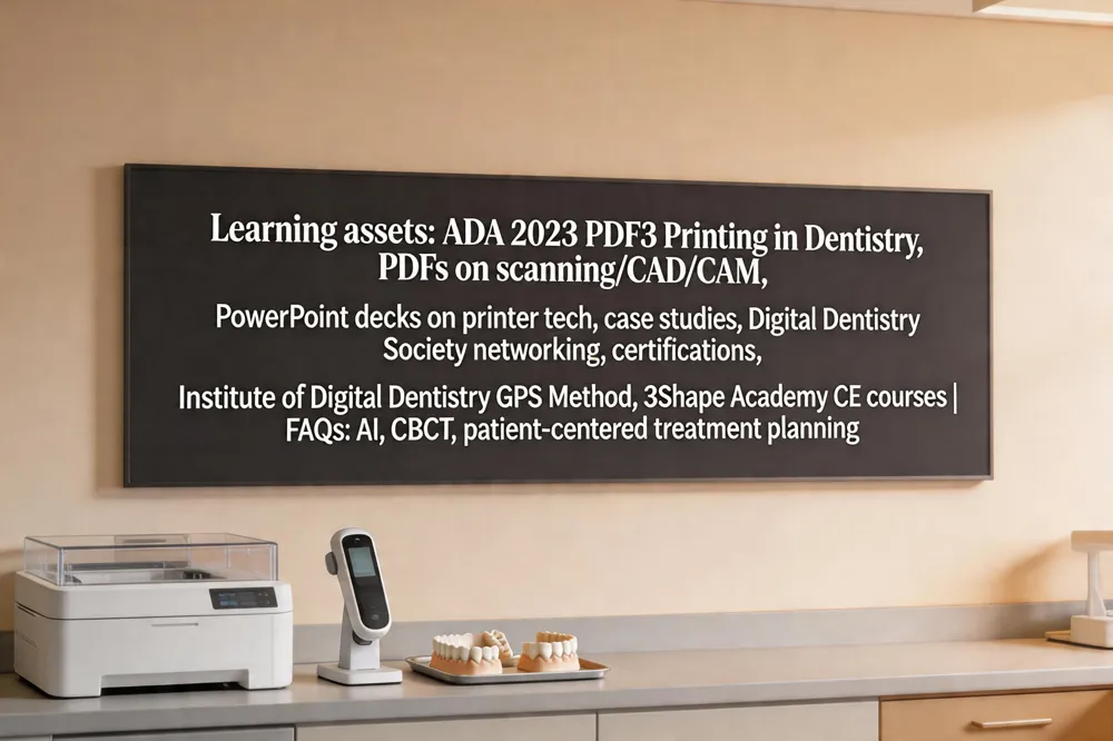 Dental professionals seeking to deepen their digital expertise can tap a range of high‑quality resources. PDF guides such as a downloadable overview of intra‑oral scanning, CAD/CAM design, 3D printing, and electronic record integration illustrate patient benefits and streamline workflow efficiency. The ADA’s 2023 3D Printing in Dentistry PDF delivers step‑by‑step protocols, material selection charts, and safety standards for office‑based printing. For visual learners, PowerPoint decks cover printer technologies, material science, and clinical case studies, highlighting reduced waste and faster turnaround ("3D Printing in Dentistry PPT"), while a broader "Digital Dentistry PPT" contrasts traditional impressions with modern scanners, CAD/CAM, and additive manufacturing. Professional societies like the Digital Dentistry Society (DDS) provide global networking, certifications, and research on scanners, 3D printing, and AI‑driven diagnostics. Continuing‑education courses—including the Institute of Digital Dentistry’s GPS Method and 3Shape Academy—offer hands‑on training and CE credit for same‑day workflows. Frequently asked questions are addressed: AI will automate routine analysis but will not replace skilled technicians; advancing cone‑beam CT, digital impressions, and rapid 3D printing enhance diagnosis, lessen invasiveness, and enable patient‑centered treatment planning.