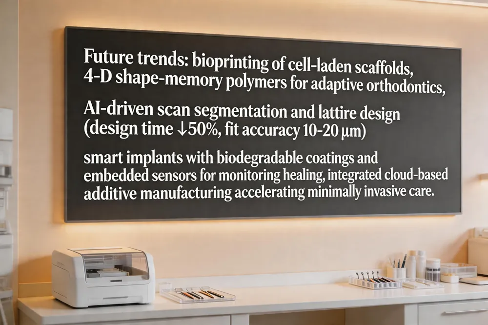 The next wave of dental innovation is being driven by bioprinting, 4D printing adds a time dimension: shape‑memory polymers respond to moisture or temperature, creating orthodontic appliances that adapt as the mouth heals. AI‑powered software now automatically segments intra‑oral scans, designs optimal internal lattice structures, and predicts mechanical performance, reducing design time by up to 50 % and improving fit accuracy to within 10‑20 µm. Smart implants equipped with biodegradable, cell‑laden coatings and embedded sensors are being trialed to monitor healing and stimulate natural tissue integration, turning a static prosthesis into a dynamic, regenerative platform. Together, these digital dental solutions—scanners, CAD, cloud‑based workflow management, and additive manufacturing—deliver faster, more accurate, minimally invasive care, positioning the future of dentistry as a patient‑focused, regenerative, and technology‑rich discipline.