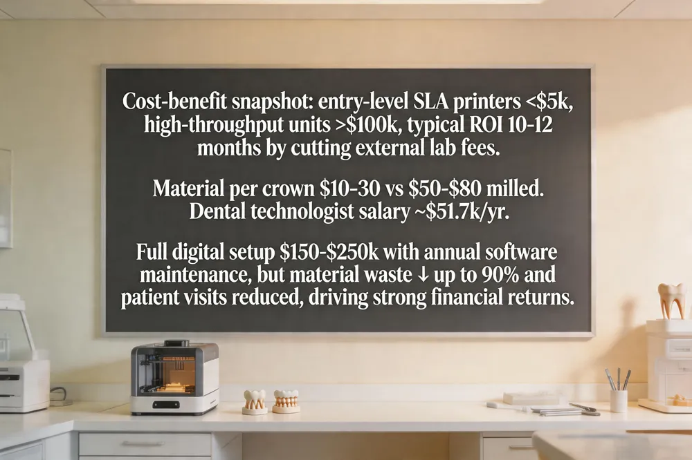 ROI – Initial digital‑dentistry setup (scaners, CAD/CAM software, printers) ranges $150‑$250 k, plus annual software, training, and maintenance costs. However, the rapid on‑site production of crowns, bridges, and surgical guides reduces lab turnaround, cuts material waste by up to 90%, and shortens patient visits—factors that boost practice efficiency, increase case acceptance, and generate a strong return on investment.