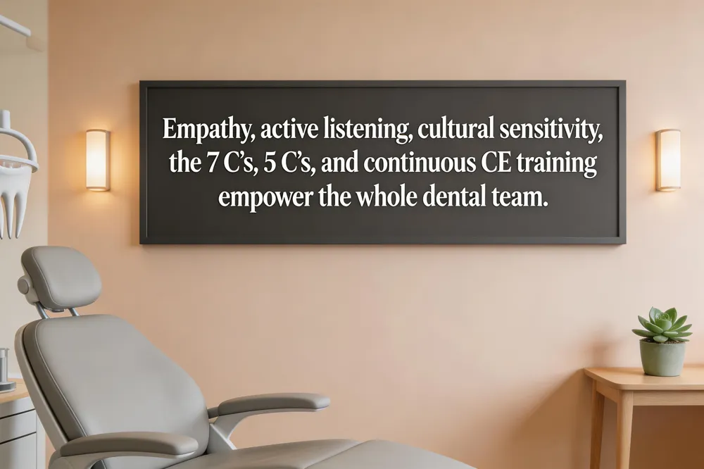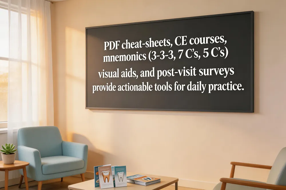 Training resources: Numerous continuing‑education courses (AGD, ADA) and PDFs—such as the “Communication in Dentistry” guide—cover the 5 C’s, active‑listening techniques, and visual‑aid integration. Online webinars, role‑playing workshops, and AI‑driven chat‑bot simulations provide flexible, evidence‑based training for the whole dental team.