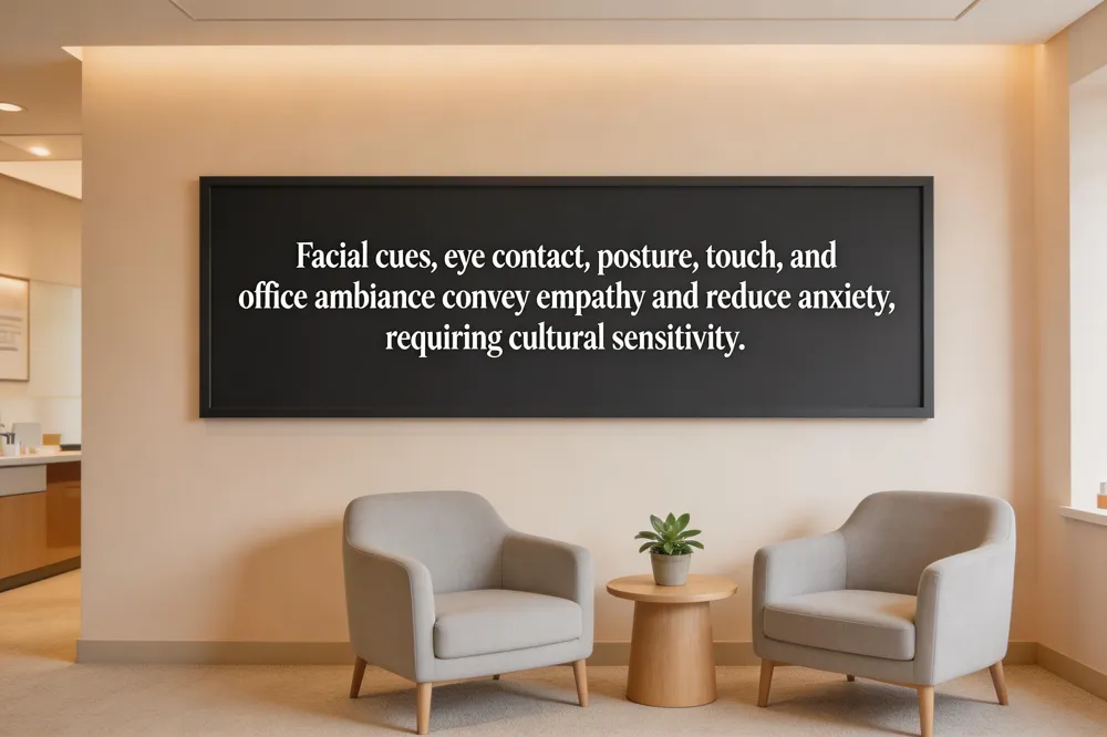 Non‑verbal communication (NVC) is a cornerstone of dental care, conveying emotions, trust and reassurance faster than words. Dentists and staff read patients’ facial expressions, eye contact, posture and breathing to gauge fear, pain or discomfort, and they use calm tone, gentle touch and open body language to reduce anxiety. The office environment—cleanliness, soft lighting, soothing décor and the way staff greet patients—delivers powerful non‑verbal cues that shape first impressions and confidence in treatment. Cultural differences affect how gestures such as eye contact or personal space are interpreted, so clinicians must adapt their NVC style to each patient’s background. By consciously aligning spoken explanations with consistent body language, dentists build stronger rapport, improve compliance and enhance overall treatment outcomes.