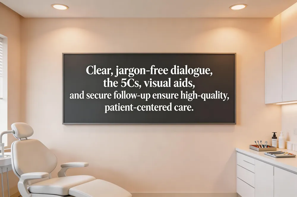 Timeliness and simplicity – Deliver concise information promptly, supported by visual aids (infographics, intra‑oral images) that increase patient understanding by ~40% (Dental Communication Dos & Don'ts).