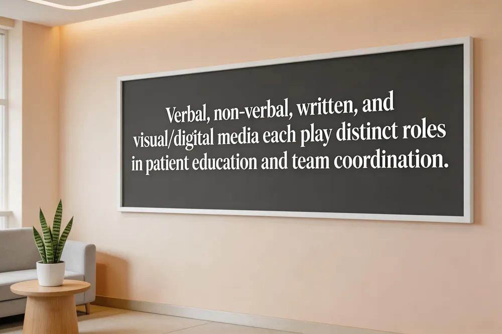 In dentistry, communication occurs through several distinct channels that together support patient care and teamwork. Verbal communication involves spoken words between the clinician, patient, and staff, allowing explanations of diagnosis, treatment options, and instructions. Non‑verbal cues such as facial expressions, eye contact, posture, and gestures convey empathy, build trust, and can signal patient anxiety or understanding. Written communication includes consent forms, treatment plans, instructions, and electronic messages, ensuring that information is recorded and can be reviewed later. Visual aids and digital media—diagrams, intra‑oral photographs, radiographs, 3‑D models, videos, and interactive animations—illustrate procedures, clarify expectations, and enhance patient comprehension, leading to higher satisfaction and adherence.