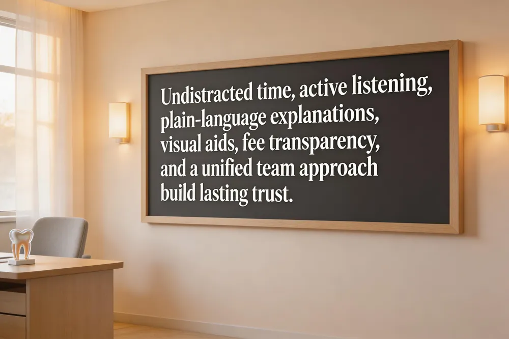 How to build trust with dental patients? Spend ample, undistracted time, listen actively, create a friendly atmosphere, explain everything in plain language, keep fee and appointment information transparent, and align the whole team around patient‑centered care.