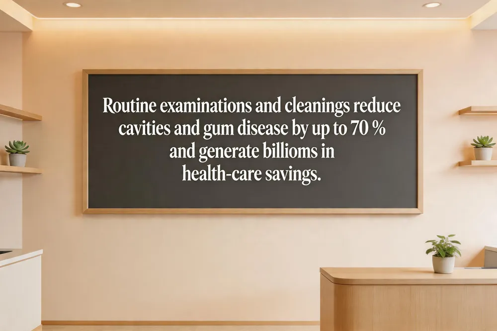 Preventive dental care is highly effective: CDC data show up to a 70 % reduction in cavities and gum disease with routine exams and cleanings, and national analyses report net savings of $53.9 billion in 2006 when primary preventive services reached 90 % coverage. Early screening lowers the odds of advanced periodontal disease, which is linked to heart disease, stroke, and diabetes, thereby improving systemic health outcomes.