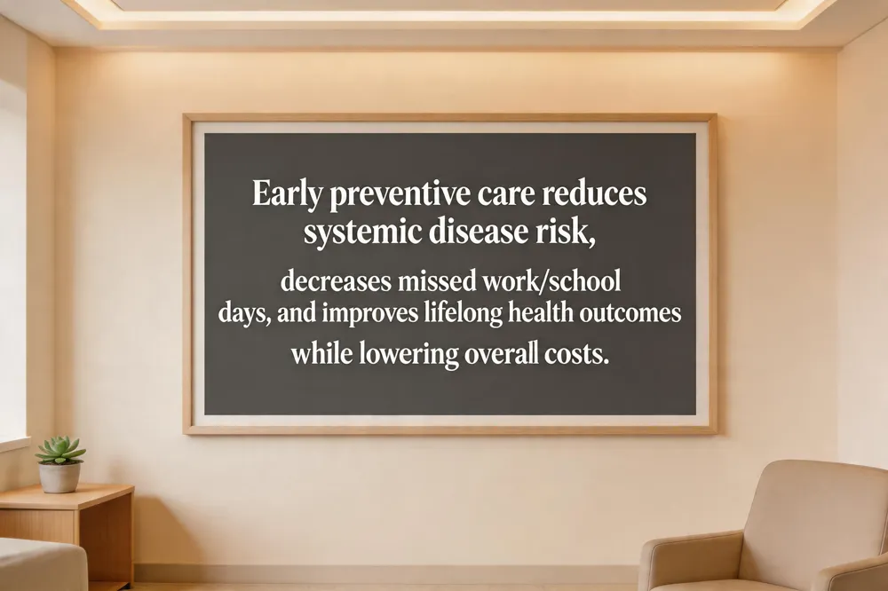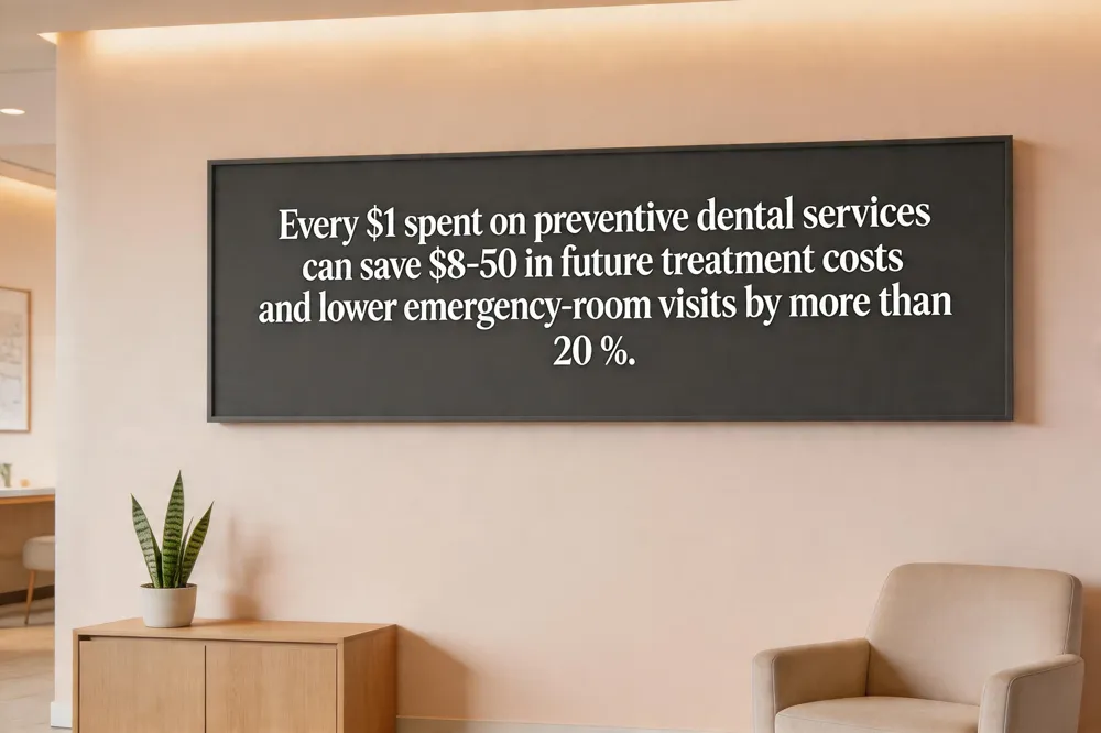 Cost‑effectiveness is evident in the broader health system: studies show that every dollar spent on preventive services can save between $8 and $50 in future dental treatment costs, and routine preventive visits lower overall medical expenses by roughly 4.4 % per year. Early detection also reduces emergency‑room visits by more than 20 % and can cut total medical costs for patients with chronic conditions, such as diabetes, by over 12 % over five years.