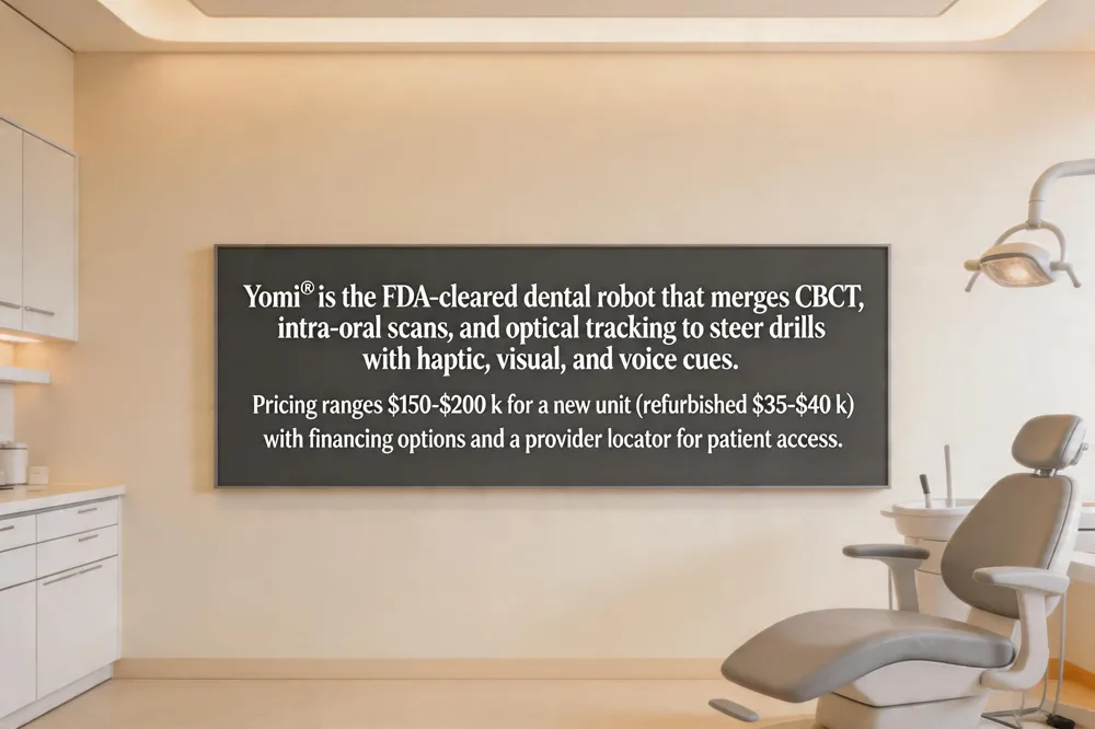 Yomi dental robot price: Base system cost $150‑$200 k, with financing options and refurbished units around $35‑$40 k; expect additional training and maintenance expenses.