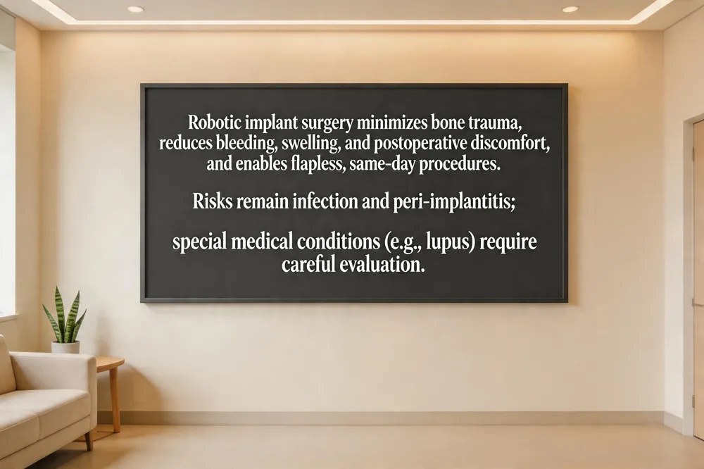 Patients experience markedly less postoperative discomfort because the robot enables flapless, minimally invasive drilling, reducing tissue trauma, bleeding and swelling. Average chair time per implant drops to about six minutes, allowing same‑day placement and provisional restoration, which shortens overall treatment time and improves satisfaction.