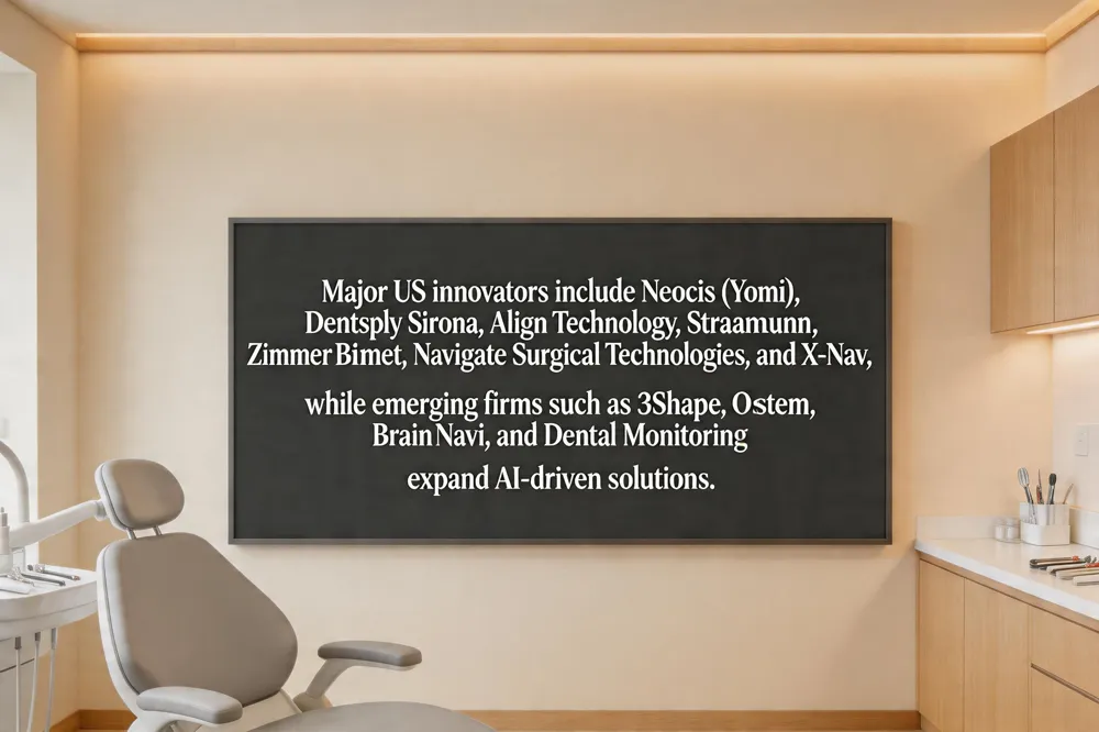 Dental robotics companies Key U.S. innovators include Neocis (Yomi), Dentsply Sirona, Align Technology, Straumann, Zimmer Biomet, Navigate Surgical Technologies, and X‑Nav Technologies. Emerging firms such as 3Shape, Osstem Implant, Brain Navi Biotechnology, and Dental Monitoring are expanding the market with AI‑enhanced solutions.