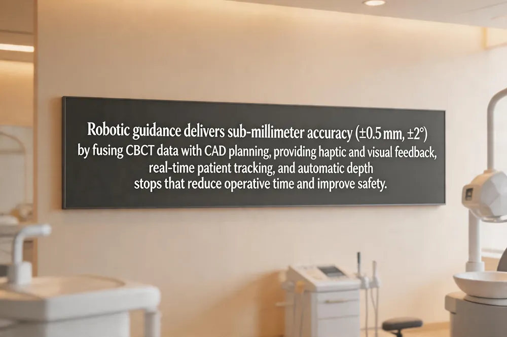 Robotic guidance brings sub‑millimeter accuracy to dental implant surgery. By fusing cone‑beam CT scans with CAD planning, the robot translates a virtual 3‑D model into a physical drill trajectory that stays within ±0.5 mm and ±2° of the planned position, far tighter than the 1–2 mm deviation typical of free‑hand placement.