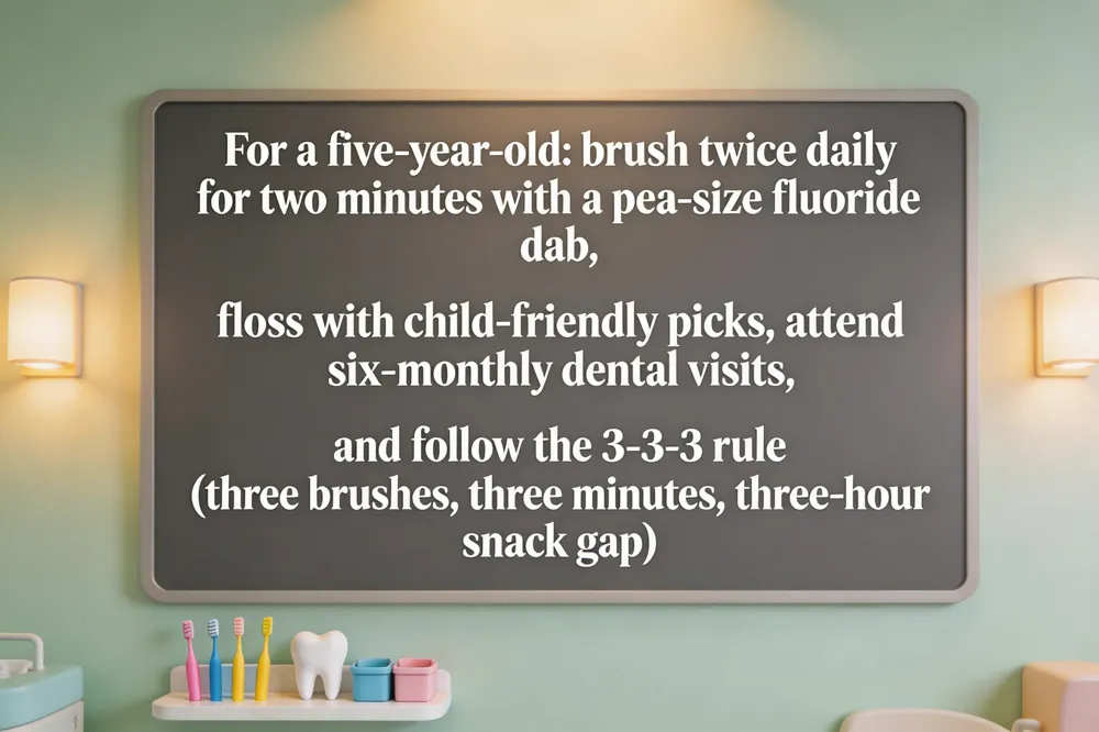 A five‑year‑old should brush twice a day for two minutes with a soft‑bristled toothbrush and a pea‑sized amount of fluoride toothpaste, spitting out the paste rather than swallowing it. Daily flossing—using child‑friendly floss picks or a flosser—removes plaque between the teeth that touch. Schedule a dental check‑up every six months; the dentist can apply fluoride varnish, assess the need for sealants on the permanent molars, and reinforce proper technique. Encourage drinking fluoridated tap water and limit sugary snacks and drinks to lower cavity risk. Supervise brushing until the child can reliably clean all surfaces, usually around age six to seven.