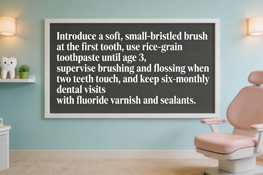 Good dental care for children starts early and continues with age‑appropriate habits. Before teeth appear, gently wipe gums twice daily with a soft, damp cloth after each feeding. As soon as the first tooth erupts, introduce a soft, small‑bristled toothbrush and brush twice a day. Use a rice‑grain‑sized smear of fluoride toothpaste for children under three, then switch to a pea‑sized amount once they can spit it out (generally by age three). Supervise brushing until the child can reliably clean all surfaces, usually around age six. When two teeth touch (around age two to three), Introduce flossing when two teeth touch, using child‑friendly picks or flossers. Schedule a dental check‑up by the first birthday and maintain six‑monthly visits, during which the dentist may apply fluoride varnish and sealants for added protection. Encourage drinking fluoridated tap water and limit sugary snacks and drinks, especially between meals, to reduce plaque‑producing acids.