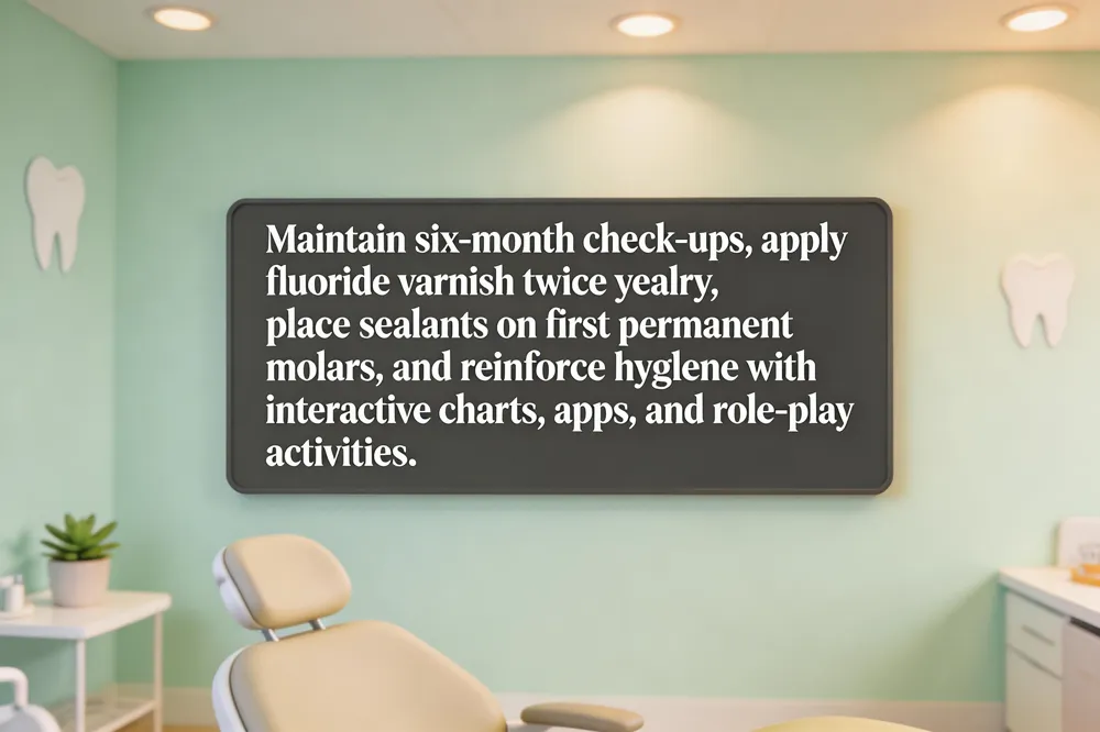Fluoride Varnish, Sealants, and Preventive Care Fluoride varnish applied twice a year strengthens enamel and can prevent up to one‑third of cavities in primary teeth. When the first permanent molars erupt (around age six), sealants should be placed on chewing surfaces to reduce cavity risk by up to 80%. Together with a fluoride‑rich diet and water, these measures form the backbone of preventive care.