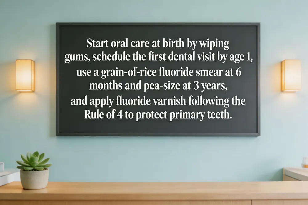 Early fluoride use and the Rule of 4 - When the first tooth appears (≈6 months), use a soft‑bristled brush and a smear of fluoride toothpaste the size of a grain of rice. Switch to a pea‑size amount at age 3. The “Rule of 4” (often cited as 7 + 4) reminds clinicians that by 7 months a child should have the first primary tooth and by 11 months (four months later) a total of four teeth should be present, prompting timely fluoride varnish applications.