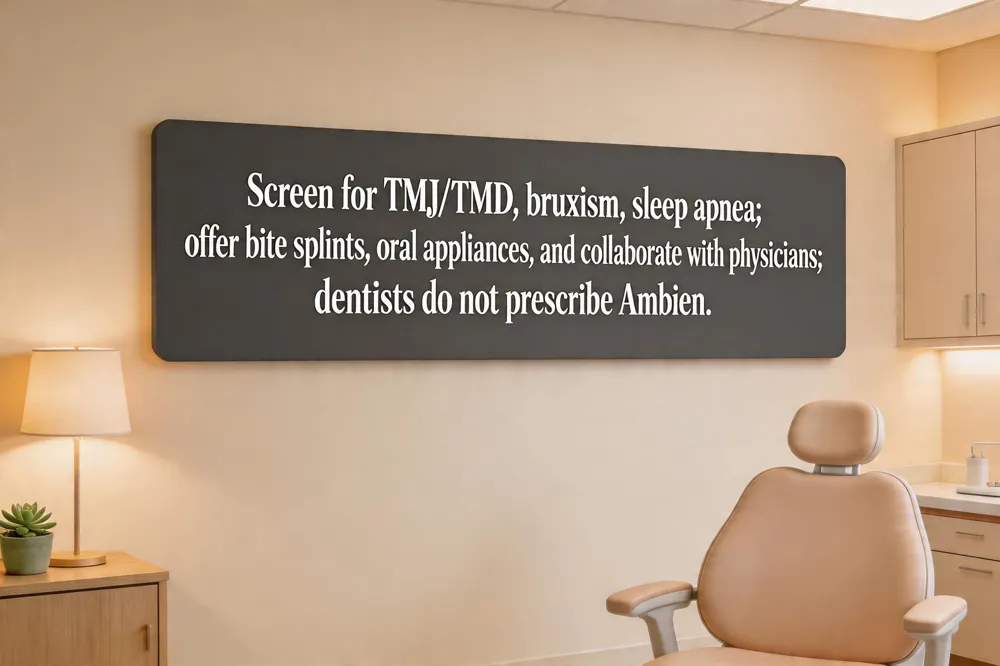 Regarding prescribing, dentists are authorized to write medications for dental anxiety, pain, and short‑term sedation. However, Ambien (zolpidem) is a controlled‑substance typically prescribed by a physician after a full medical assessment. Our practice tracks sleep concerns, discusses them with patients, and collaborates with their healthcare team to ensure proper treatment while remaining within the dental scope of practice.