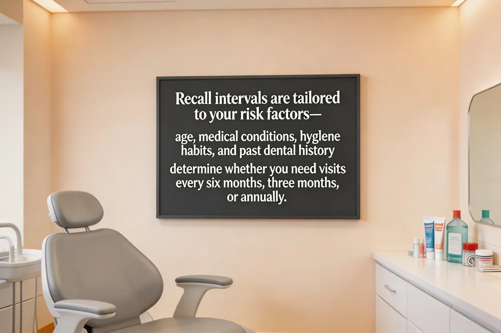 Risk‑based scheduling tailors recall intervals to each patient’s profile rather than a universal rule. Age, medical conditions (diabetes, heart disease, Sjögren’s), hygiene habits, past cavities or gum disease, smoking, and dry‑mouth medications help determine six‑month, three‑month, or annual visits.