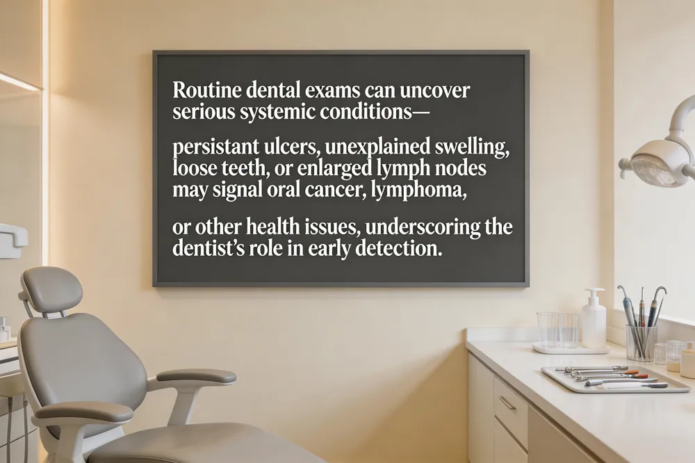 Dental professionals play a vital role in uncovering serious health conditions that first appear in the mouth. During a routine oral exam, a dentist evaluates soft tissues, gums, and surrounding structures, looking for warning signs of oral cancer, lymphoma, and other systemic illnesses. Persistent ulcers, unexplained swelling of the palate or gums, loose teeth without trauma, and painless enlarged neck lymph nodes can all point toward lymphoma. Because these findings can mimic common dental problems, a thorough oral cancer screening is essential; any suspicious tissue changes prompt a biopsy or referral to a medical specialist for definitive diagnosis. Early detection through regular dental visits greatly improves treatment outcomes. In addition, gum disease has been linked to systemic conditions such as diabetes, heart disease, hypertension, and stroke, underscoring the importance of periodontal health for overall well‑being. Dentists therefore serve as frontline detectors of both oral and systemic disease, ensuring timely intervention and coordinated care. Dr. Burns and her team are trained to recognize these red‑flag findings and will guide patients promptly when a lymphoma is suspected.