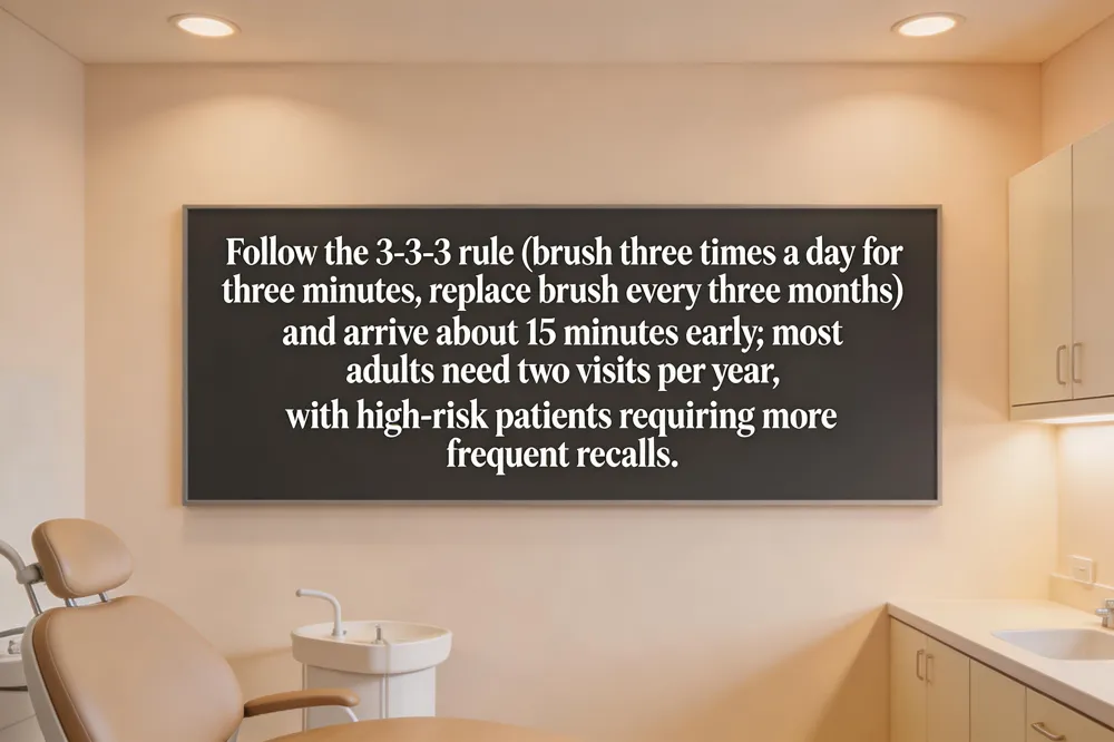 Regular dental care follows a few simple guidelines that keep your smile healthy and your visits efficient. The 3‑3‑3 oral‑care rule reminds patients to brush three times a day, spend about three minutes each time, and replace the brush or electric head every three months. Adding a three‑step routine—brush, floss (or inter‑proximal cleaning), and rinse with fluoride mouthwash—helps remove plaque and reduces the risk of cavities and gum disease.