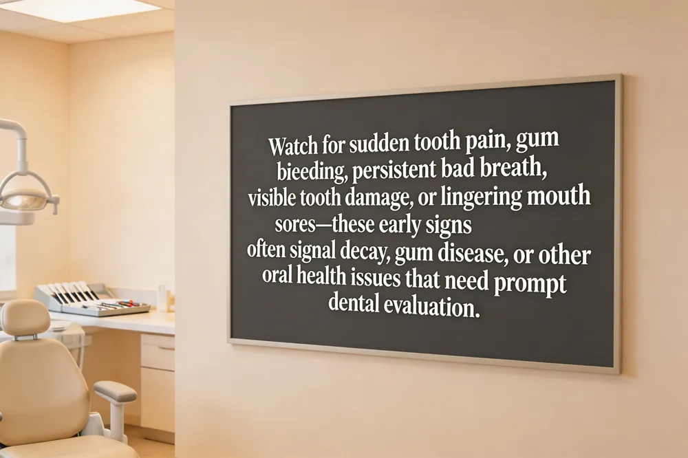 What are signs I should see a dentist? If you notice any of the above symptoms—persistent pain, gum bleeding, bad breath, visible tooth changes, or lingering sores—schedule an appointment promptly. High‑risk factors such as diabetes, pregnancy, tobacco use, or dry mouth also warrant earlier evaluation.