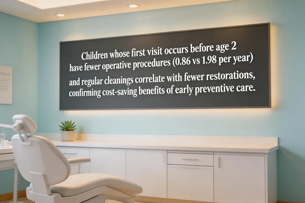 Economic impact of preventing restorative work – Retrospective data from 363 children (0‑4 years) showed that those whose first visit occurred before age 2 required fewer operative procedures per year (0.86 vs 1.98; p < 0.05). Each additional cleaning exam correlated with fewer restorations (r = ‑0.250, p < 0.001). Because a single filling can cost $100‑$300 and more extensive work (root canals, crowns) runs $700‑$5,000, the reduction in restorative visits saves families $200‑$500 per tooth over a child’s lifetime and contributes to broader health‑care savings (studies report $8‑$50 saved for every $1 spent on prevention).