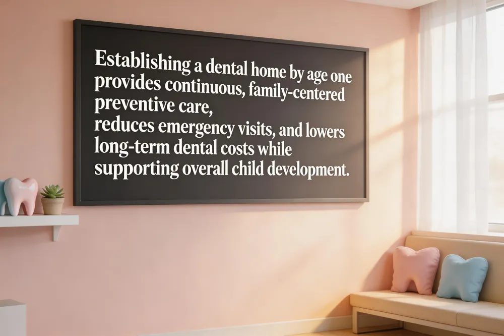 A dental home is a continuous, family‑centered practice where a child receives comprehensive preventive care, risk‑based caries assessments, and anticipatory guidance from the first tooth eruption onward. Establishing this home by age one ensures timely access to fluoride varnish, sealants, and oral‑hygiene counseling, allowing clinicians to intercept disease before it progresses. Because care is coordinated and predictable, families experience fewer emergency dental visits, and studies show a measurable drop in restorative procedures and associated costs over the child’s early years.