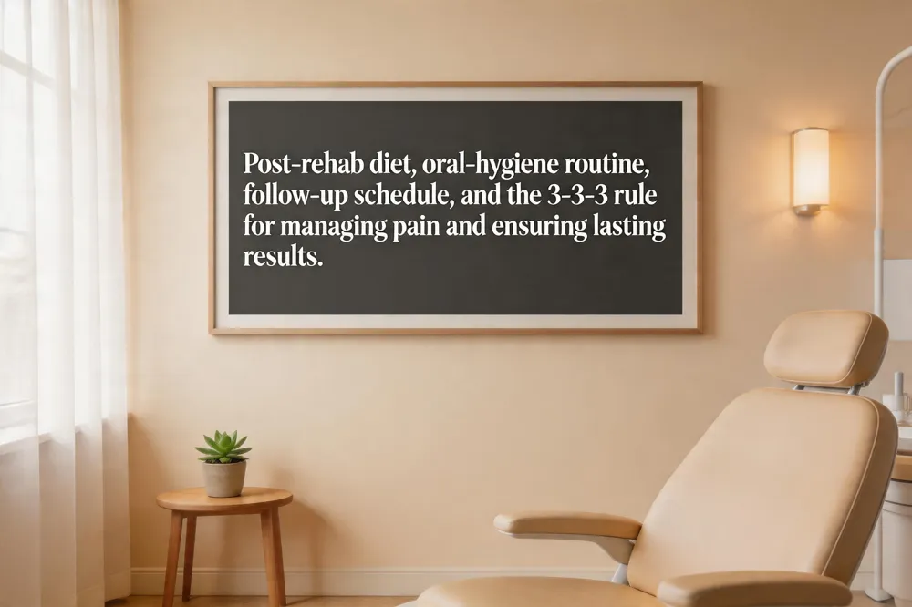 After completing a full‑mouth rehabilitation, a soft‑food diet (yogurt, smoothies, mashed potatoes, scrambled eggs, and applesauce) for the first 1‑2 weeks protects healing implants, crowns, and graft sites while minimizing pain and swelling. Patients should then resume meticulous oral hygiene—brushing twice daily with a soft‑bristled brush, flossing once a day, and using an antimicrobial mouthwash—to keep bacteria away from surgical sites and newly placed restorations. Regular six‑month check‑ups are essential for evaluating the integrity of crowns, bridges, and implants; during these visits the dentist can assess bite stability, adjust occlusion, and prescribe night‑guards to guard against bruxism that could fracture restorations. Monitoring for peri‑implantitis—signs of redness, swelling, bleeding, or radiographic bone loss—is critical, as early intervention prevents implant failure.