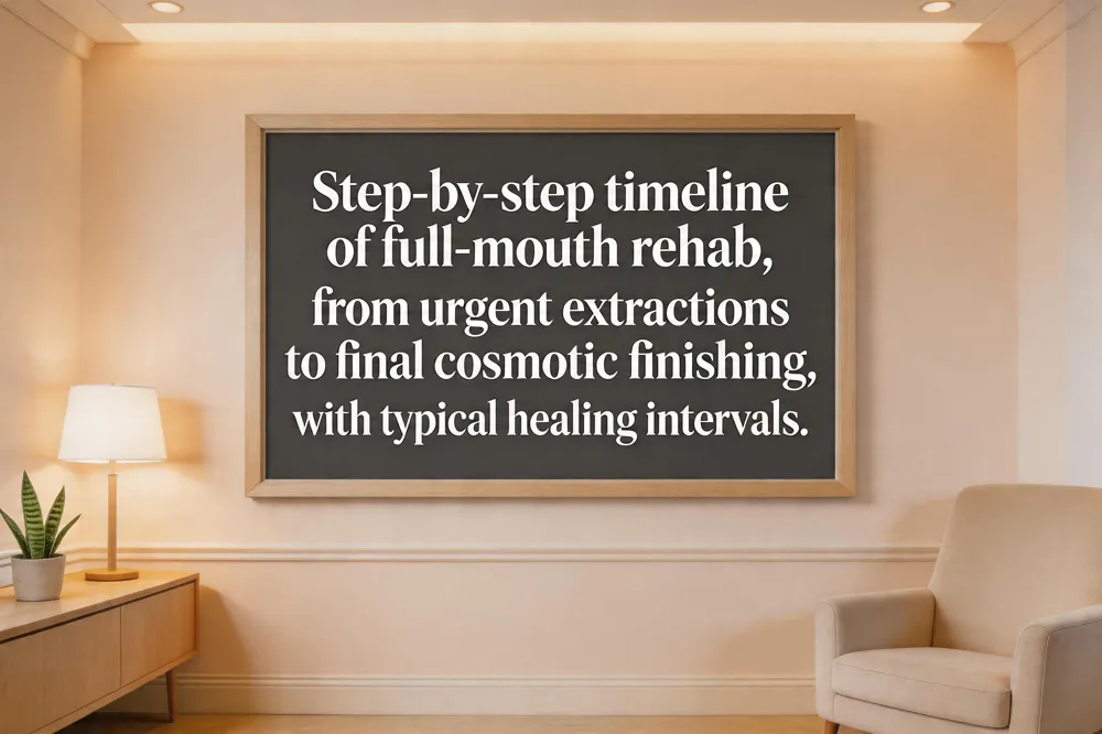 How long does full mouth rehabilitation take? The timeline varies widely; simple crown‑and‑bridge cases may finish in a few months, while implant‑based plans often require 6–12 months to allow for surgery, healing, and prosthetic placement.
