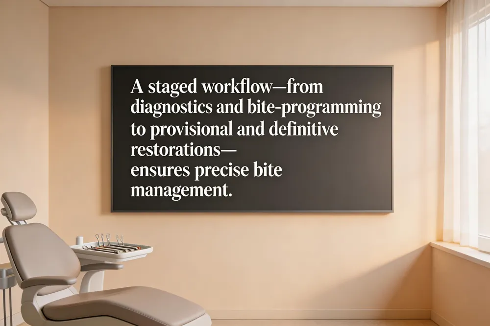 The journey begins with a comprehensive diagnostic package: medical history, intra‑ and extra‑oral exams, panoramic X‑rays, CBCT scans, intra‑oral photographs, and digital impressions. These records reveal decay, periodontal disease, bone quality, and occlusal deficiencies. Initial disease control—scaling, root‑planing, extractions of hopeless teeth, and bone grafts or sinus lifts—creates a healthy foundation. A deprogrammed bite record is taken using a Quick Splint or leaf gauge to establish the true centric relation (CR) and to assess the need for vertical dimension of occlusion (VDO) increase.