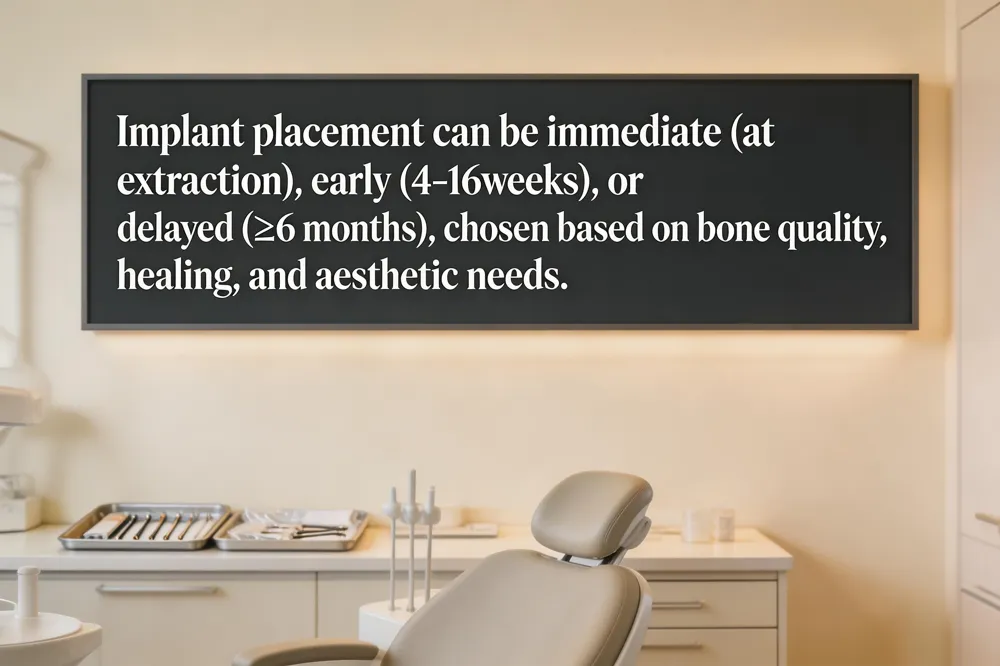 Implant placement can be performed immediately at the time of tooth extraction when the socket walls are intact, there is at least 1 mm of facial bone, and primary stability can be achieved (insertion torque ≥ 30‑40 N·cm or ISQ > 65). Early placement (4–16 weeks after extraction) allows soft‑tissue healing and partial bone regeneration before implant insertion, making it suitable when modest bone remodeling is needed. Delayed or late placement (≥6 months) is chosen for extensive ridge resorption, major grafting, or when the site requires full bone maturation. Factors influencing timing include bone quality and quantity (Misch Class I‑IV), systemic health, smoking, bruxism, and aesthetic demands, especially in the anterior maxilla. Proper case selection ensures adequate primary stability, minimizes marginal bone loss, and leads to high long‑term survival rates (92‑98 %).