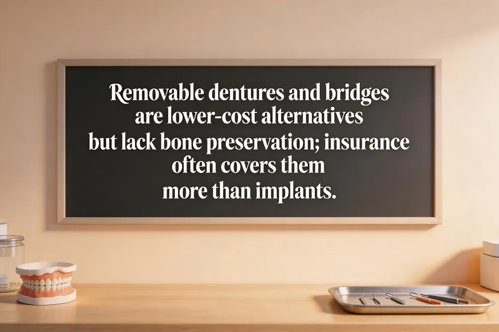 Removable dentures and bridges remain the most common non‑implant solutions for missing teeth. A full‑arch denture can be fabricated for a fraction of the $3,000‑$6,000 per‑implant cost, while a partial denture or a fixed bridge (using adjacent teeth as anchors) typically runs $500‑$2,500 per unit. These options avoid surgery and are generally completed in a few appointments, making them attractive for patients with limited budget or compromised bone. However, dentures do not preserve alveolar bone and may require periodic relining, and bridges involve preparation of healthy teeth, which can affect long‑term tooth health. Insurance coverage for dentures varies widely; many dental plans impose a 6‑ to 12‑month waiting period before covering major prosthetic work, and some offer no‑waiting‑period options at higher premiums. In contrast, most insurance plans treat implant placement as an elective procedure, providing little to no coverage for the implant, abutment, or crown. Therefore, while removable dentures and bridges are cheaper upfront, patients should weigh the lower initial expense against the need for ongoing maintenance and the limited preservation of jawbone density.