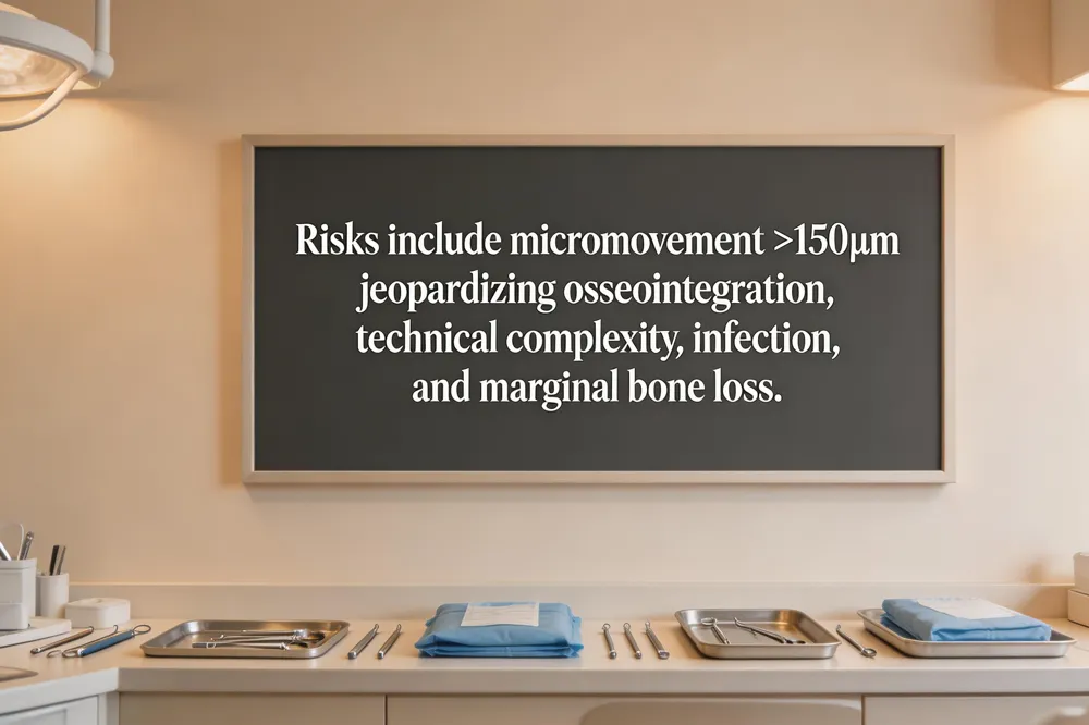 Micromovement and osseointegration jeopardy – Successful immediate loading relies on high primary stability; micromovements exceeding 150 µm at the bone‑implant interface can disrupt osseointegration and raise early‑failure rates. Even micromovements between 50 µm and 150 µm may stimulate bone remodeling but can also increase marginal bone loss when occlusal forces are excessive.