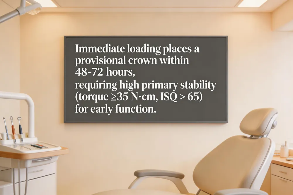 Immediate loading means that a provisional or definitive crown is placed and brought into functional occlusion within 48 – 72 hours of implant insertion. The protocol hinges on achieving high primary stability—typically an insertion torque of ≥ 35 N·cm or an ISQ > 65—so the implant can tolerate early functional forces. Candidates must be systemically healthy, have adequate bone volume and density, and be free of acute infection or uncontrolled periodontal disease. The restoration is usually screw‑retained, fabricated chair‑side or in a lab, and adjusted to avoid excessive occlusal loading while allowing normal mastication.