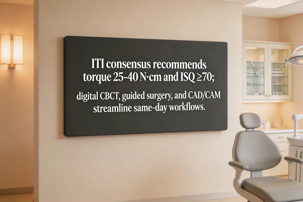Immediate loading protocols rely on consensus criteria to achieve predictable outcomes. The International Team for Implantology (ITI) consensus advises insertion torque of 25‑40 N·cm (preferably >35 N·cm) and an ISQ of ≥70 before functional loading, especially in fresh extraction sockets. These parameters ensure primary stability minimizing micromovement and protecting osseointegration.