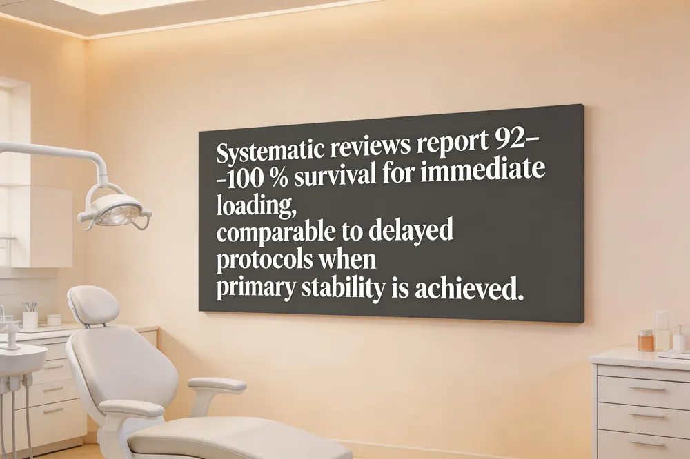 Immediate loading implants demonstrate success rates of approximately 92 %–100 % in the literature, matching or exceeding conventional delayed‑loading results. High primary stability, adequate bone density, and careful case selection are the key determinants of these outcomes, confirming immediate loading as a reliable option for suitable patients.