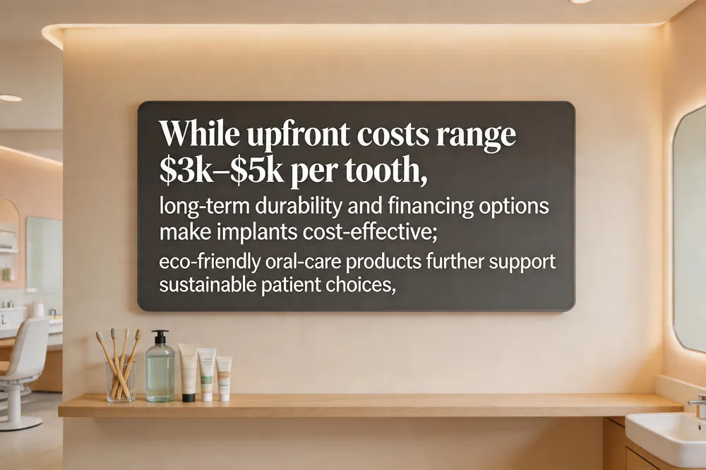 Patient reviews frequently highlight the stability, natural aesthetics, and reduced maintenance of implants compared with removable dentures. Eco‑friendly oral‑care products—biodegradable toothbrushes, bamboo handles, low‑VOC composite resins, and recyclable packaging—receive positive feedback for their environmental stewardship and comfort. Sustainable practices such as digital impressions, reusable sterilization trays, and LED curing lights further lower waste and energy use. The Eco‑Dentistry Association (EDA) provides guidelines and certification (GreenDOC™) for practices committed to green dentistry, helping patients locate environmentally responsible providers. By combining transparent pricing, financing options, and sustainable clinical protocols, patients can achieve lasting oral health while supporting a healthier planet.
