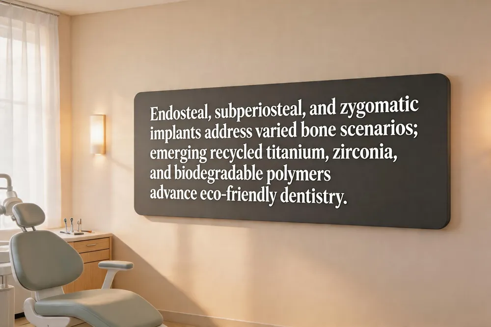 Emerging eco‑friendly implant materials are reshaping the field. Biocompatible titanium remains a staple, but manufacturers are introducing recycled titanium alloys, zirconia ceramics, and biodegradable polymer components that lower the carbon footprint. Digital intra‑oral scanning and CAD/CAM milling reduce waste by eliminating stone models and disposable trays, while recyclable packaging and reusable sterilization trays further cut environmental impact.
